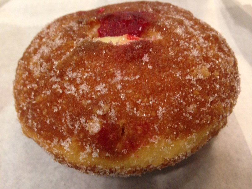 The famous macarons take up the lion’s share of the display case, but the keen-eyed will spot the doughnuts. All are filled doughnuts with a choice of three flavours – strawberry jam, Nutella and vanilla custard. I went with the strawberry jam.