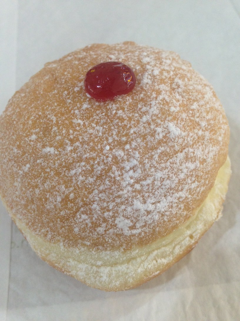 The second seems somewhat rushed in its preparation. The skin colour is darker, the dough isn’t holding its shape, the jam injection hole is messy, the dusting of sugar is no where near as evenly distributed and the blob of jam was there before the sugar.