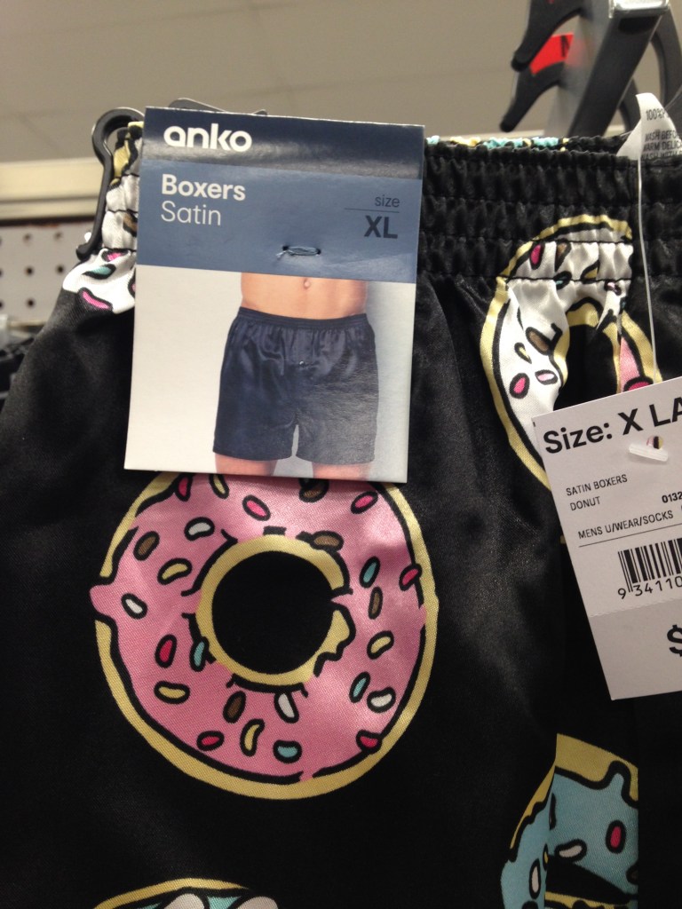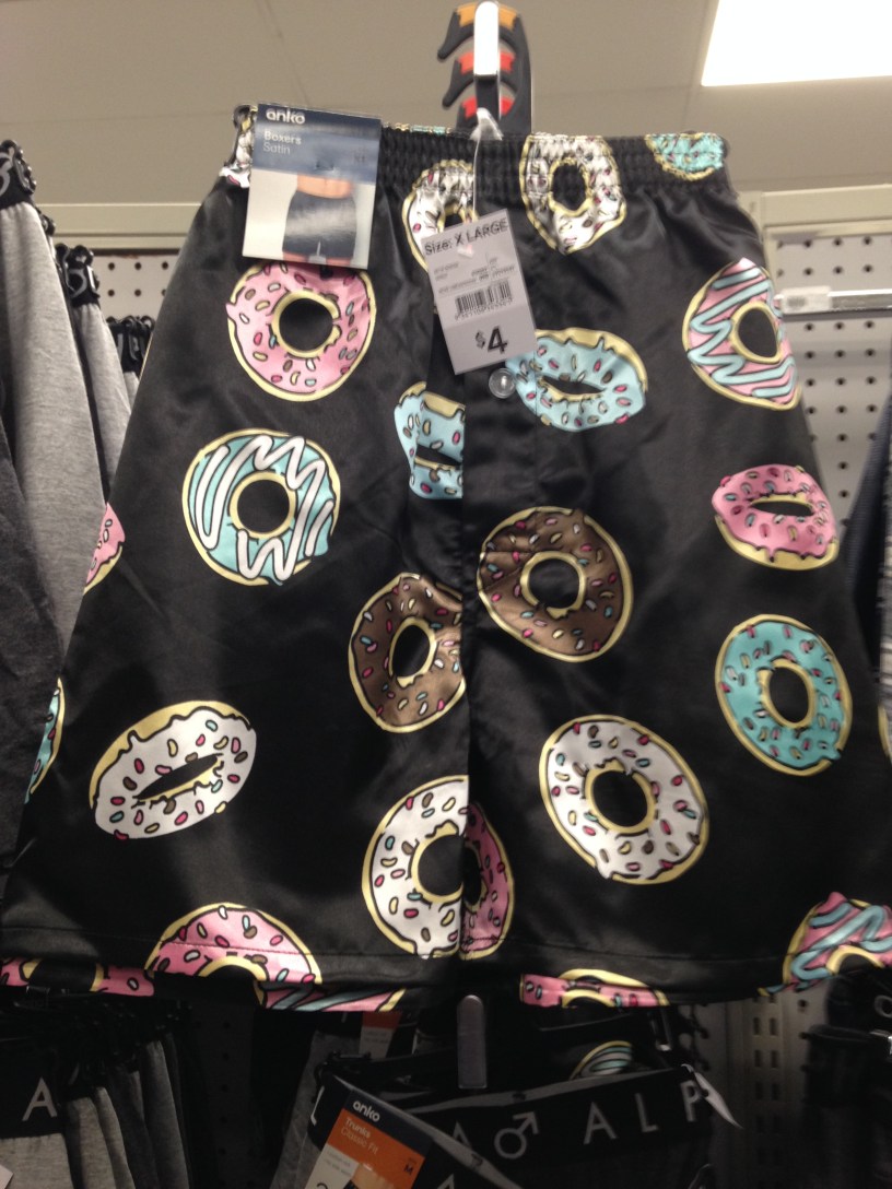 I’m walking around Kmart, thinking that some poor slaves in third world conditions have produced every item in this department store, when I came across some boxers with doughnut print.