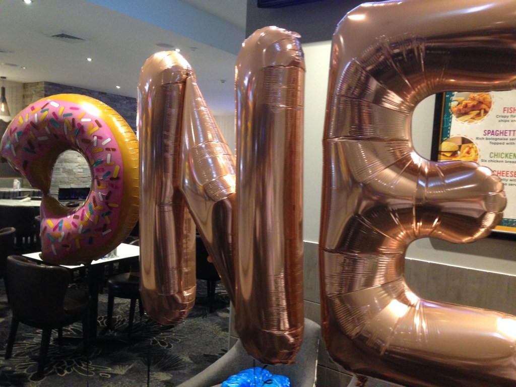 The event in question was a first anniversary, so they gave me balloons that spelled out O N E. The O was a doughnut. Very clever, working a doughnut in with the event. They know where my heart lies.
