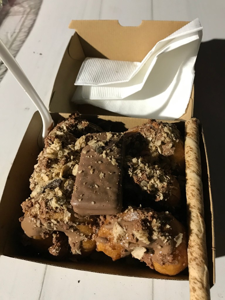 Anyway, I ordered the Tim Tam loaded doughnut pack. It had a cute name, but I forget it. Other flavours included Oreo, white chocolate, Kinder Surprise, and the ubiquitous Nutella. The guy I ordered it from had bigger muscles than Arnold Schwarzenegger. I’m sure his muscles didn’t come from scoffing doughnuts.