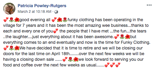 A reader, Heidi, let me know about the announcement that the store Funky Clothing in Mangawhai in New Zealand is closing down soon. The owners are going to enjoy a well-earned retirement.
