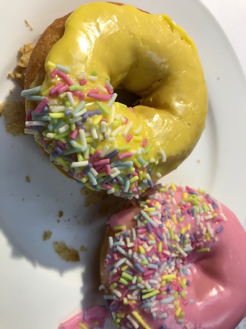 There were six small doughnuts in my pack. Two chocolate, two pink and two yellow. For some reason, I always prefer yellow.