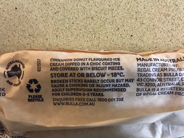 And what about the coating. What does that have to do with a cinnamon doughnut? It’s called a ‘choc-coating’ on the pack. It’s not even choc. And if it is, how is that cinnamon and/or doughnut?