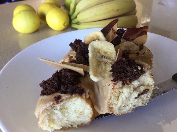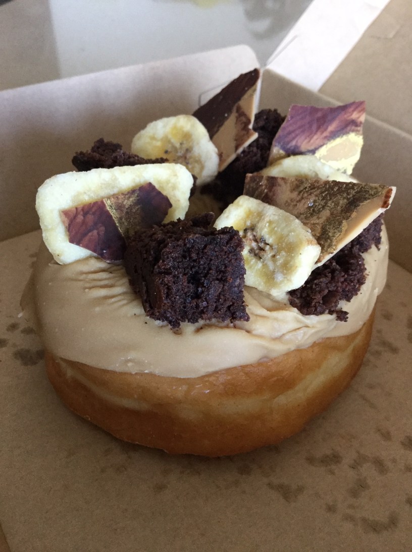 Slivers of hard caramel, dried banana chips and pieces of brownie sat on a soft caramel icing. There was loads of the topping and at $8 a pop, there’d want to be. The doughnut was the signature plump, soft and airy Donut Papi style.