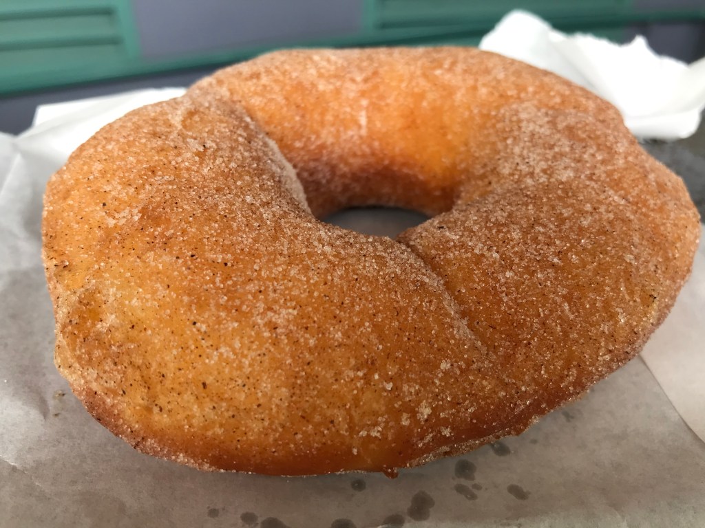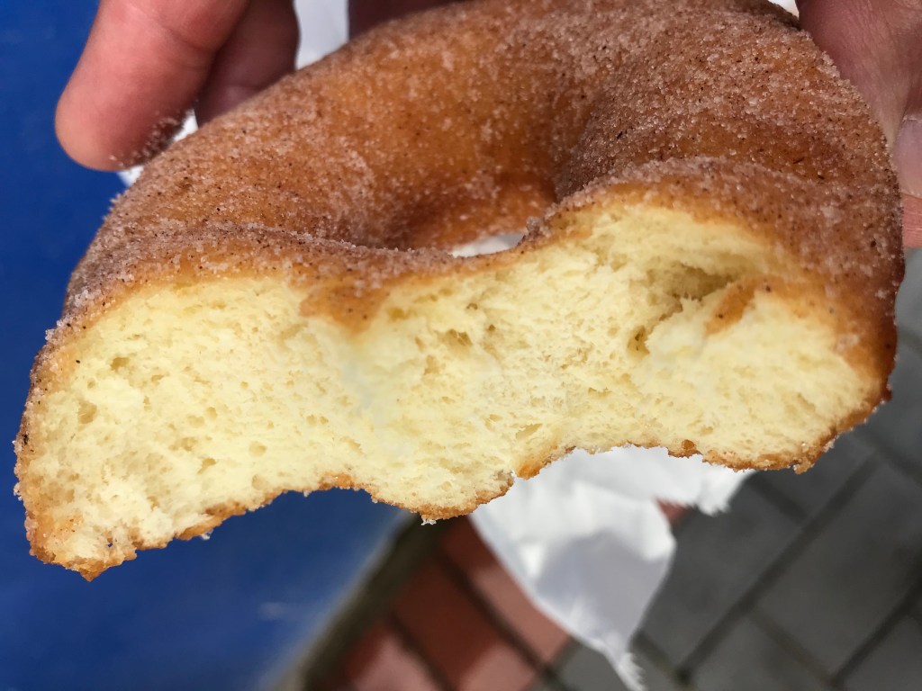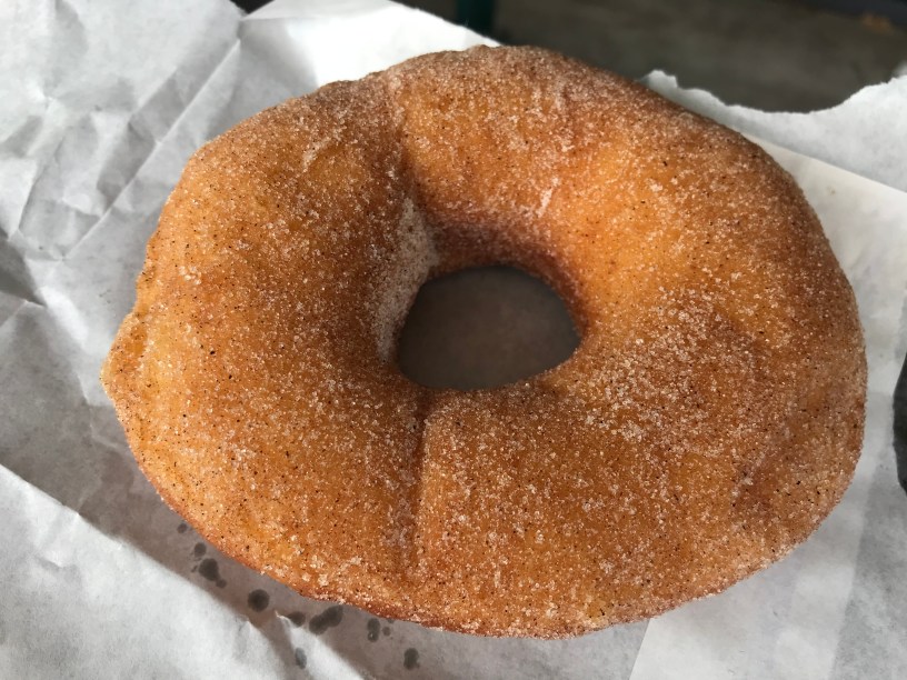 I got a cinnamon doughnut. Cinnamon doughnuts tend to usually only come in small size, but the ones in the window of Simple Simon Pies were the same size as the large iced doughnuts.