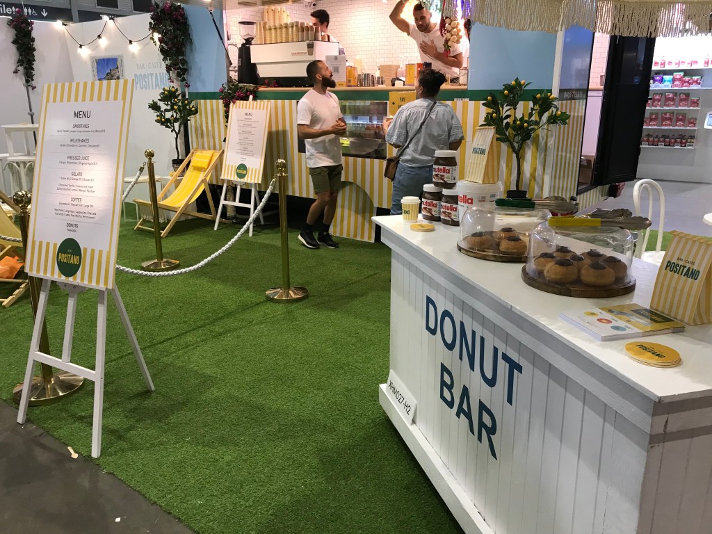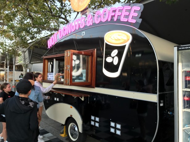 In the pavilion next to the Food Dome is a milkbar called Positano selling coffee and doughnuts. The doughnuts are commercially made.
