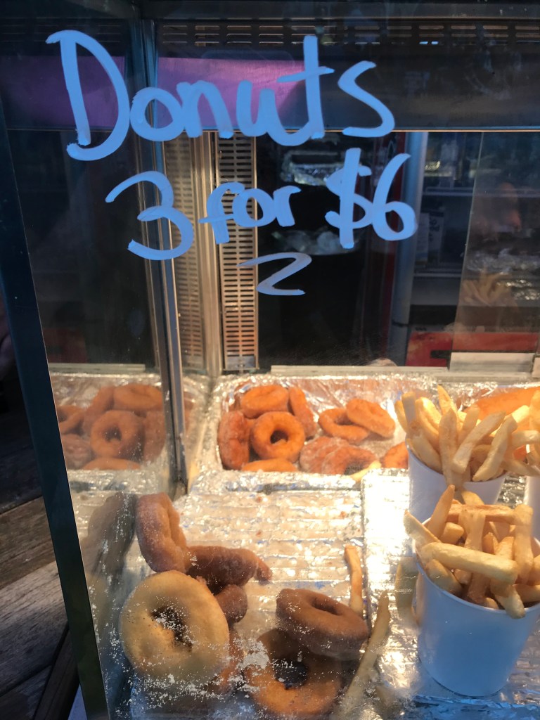 There are a few places that sell Cinnamon Doughnuts, among other things like Dagwood Dogs and hot chips. I hate to say it, but these look dreadful. They are skinny doughnuts that look more like onion rings than doughnuts. Strictly carnie food.