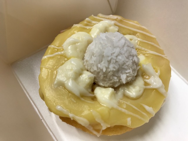 The topping had a lightly tasting lemon curd with what I guess was cheesecake. The flavours weren’t strong. There was a coconut ball on top. I thought it was going to be a Baci, but it wasn’t.