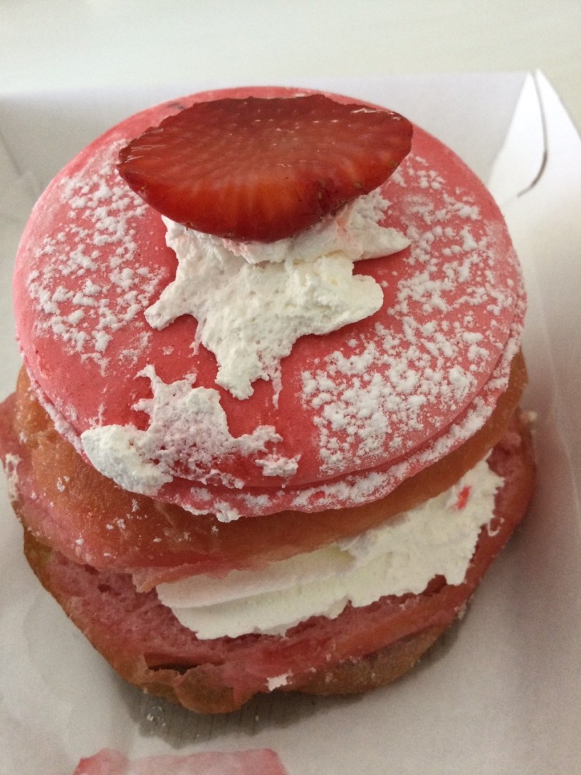 There was also cream plopped on top which was acting as an adhesive for the next elements, that being a strawberry macaron and a piece of fresh strawberry. The macaron was flat so it didn’t have a lot of meringue, but was still very nice. The doughnut also had a dusting of soft sugar.