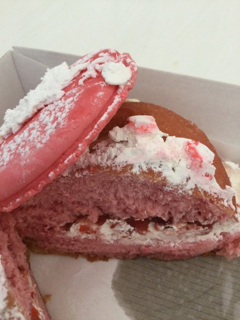 I heard their bee sting is amazing, and their cinnamon scroll looked pretty good too, but I opted for a doughnut that looked out of this world. It was a Strawberry Macaron Doughnut.