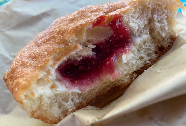 The raspberry jam is homemade. It is a perfect blend of sweet and tart. Not too runny. And there’s plenty of it, so you can enjoy it with every mouthful of dough.
