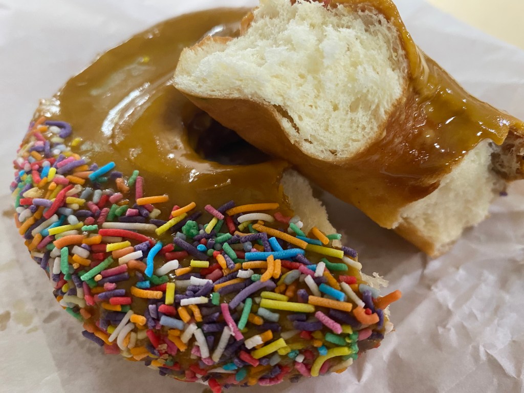The doughnut had a thick coating of caramel icing on top. It certainly dominated the doughnut eating experience.
