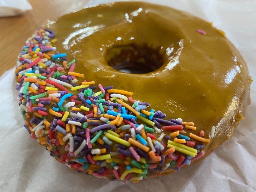The doughnut had a thick coating of caramel icing on top. It certainly dominated the doughnut eating experience.