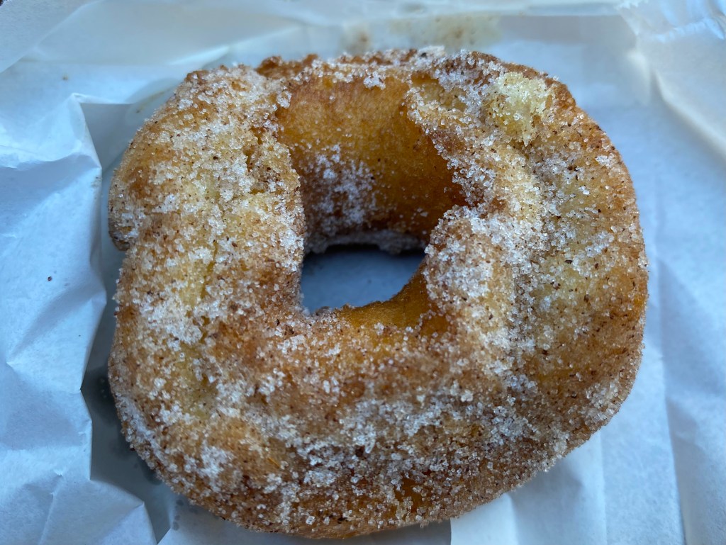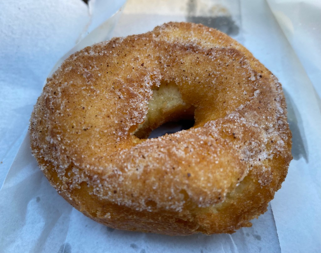 The outer shell was a little crispy. They were a little oily, but only as you’d expect a freshly cooked hot cinnamon doughnut to be. They were cooked right through, which is good, because often you get freshly cooked doughnuts that aren’t cooked properly. Also, there was no unpleasant oily after-taste.