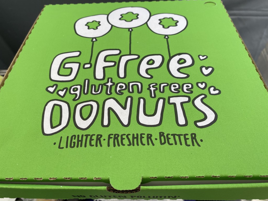 My daughter, who loves doughnuts (runs in the family) can’t eat gluten, and she loves G-Free Donuts. So when I see them, I get some for her. They are gluten-free and cooked fresh. As it turns out, they are so good, I enjoy them too.