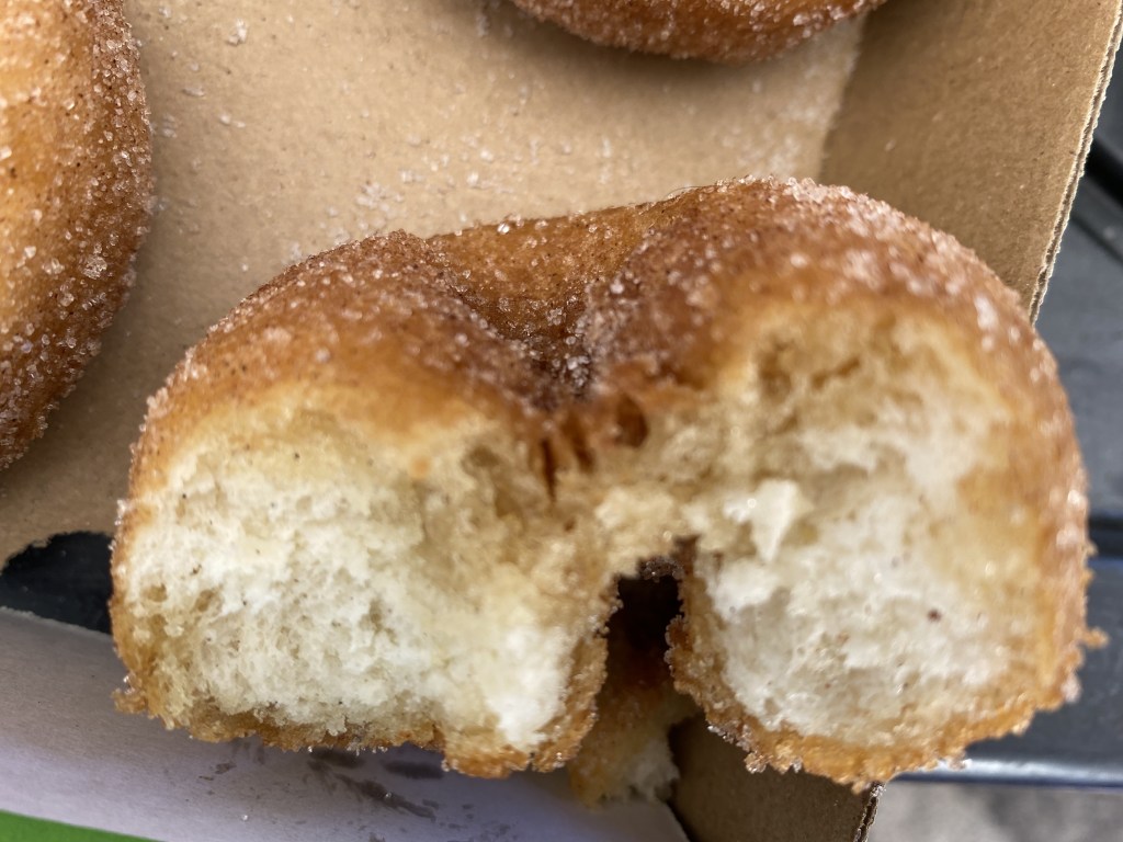 I had one almost straight away. It was warm and delicious. It was a bit oily and a smidgen undercooked, having just come from the fryer. But that was okay because it quickly dries up and is a lovely warm cinnamon doughnut.