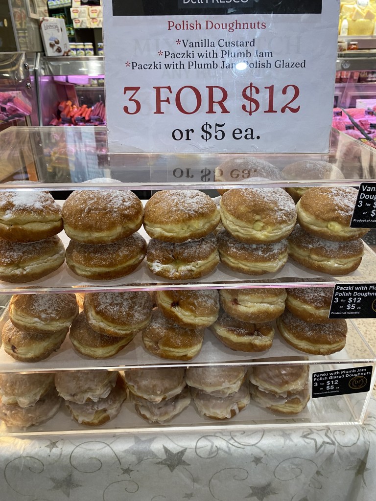 Deli Fresco is a Polish Deli in Westfield Hornsby. When I went recently, they had loads of foods for sale, including cured meats as well as cooked food. Out the front they had a special section with some hot pastries and Paczki.