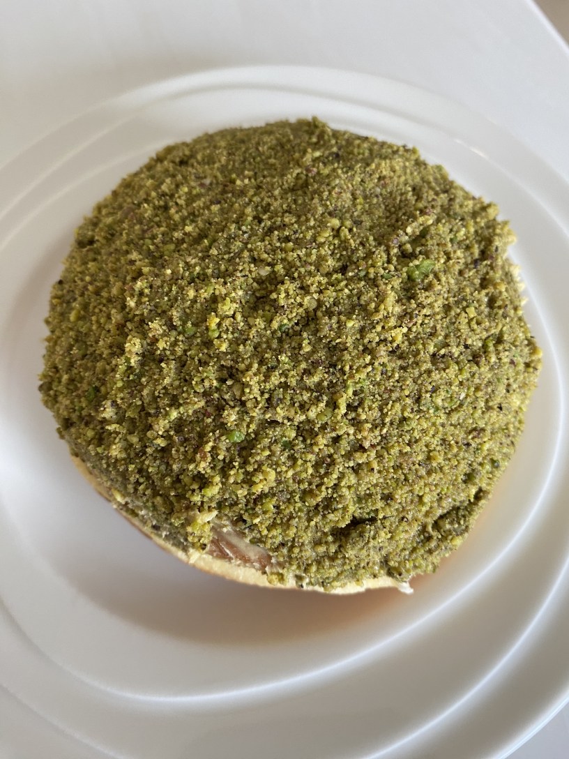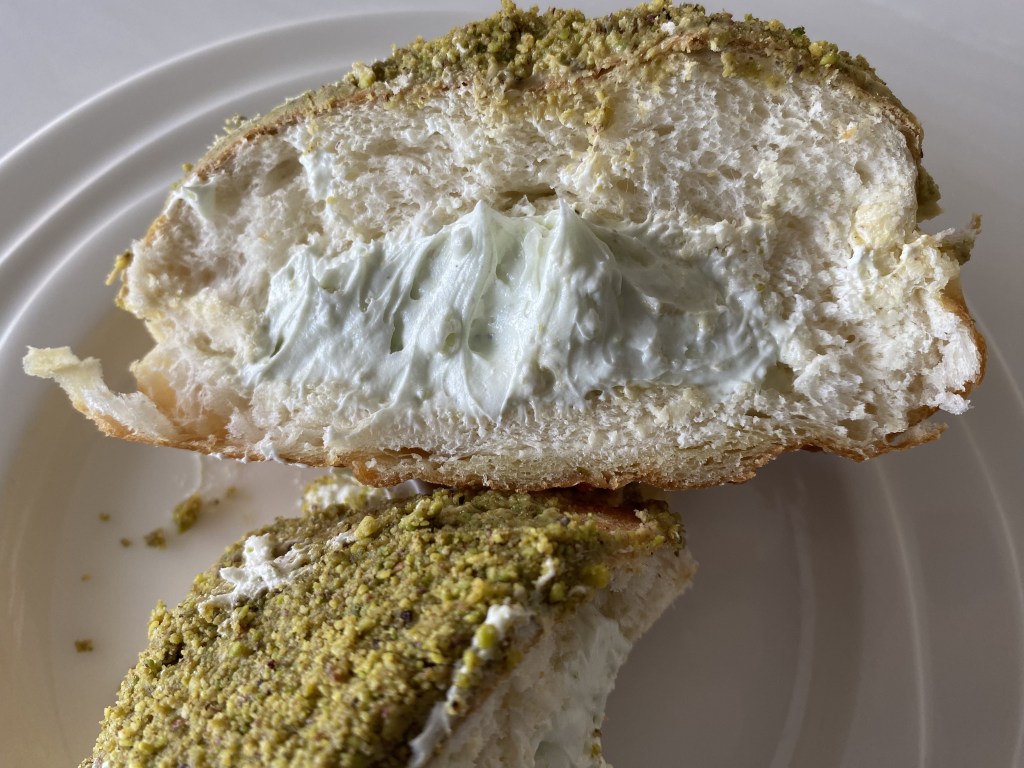 The pale green filling is a sweet pistachio cream. The first bite is lovely. But after a while, I found it too sweet. There was a lot of it too.