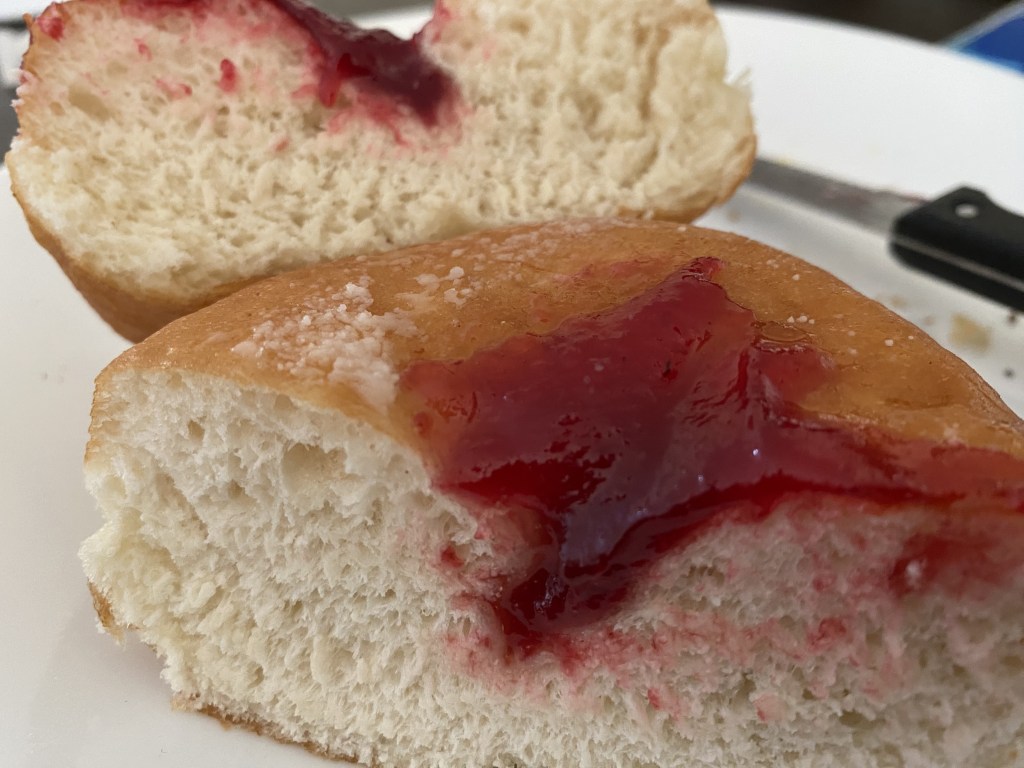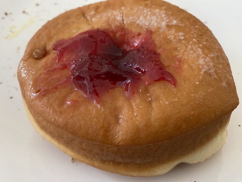 The jam was just simple commercially-made jam, which I expected given the doughnut was only $3. I didn’t photograph it until I got home, so the jam was messed up a bit, ruining the presentation. In my photo, it looks like there wasn’t much jam inside the doughnut, but there was actually a good amount.