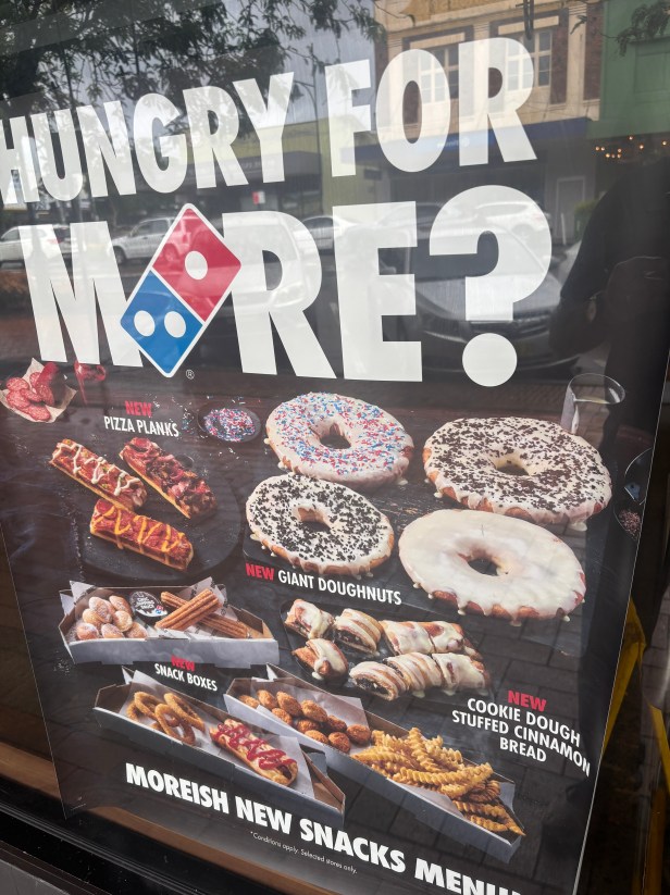 And then I noticed a sign outside a Domino’s pizza shop, which was closed at the time. They had a poster out the front advertising special limited edition Giant Doughnuts. If you have to go to Domino’s for your doughnuts, it’s a pretty sorry situation.