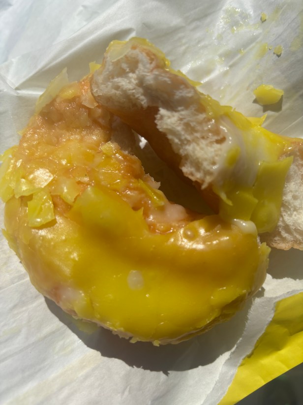 It was almost completely covered in pineapple icing. I like it when there is a lot of icing all over the doughnut, not just on top.