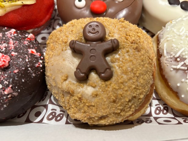 Gingerbread Man: Filled with spiced chantilly cream, coated in spiced Christmas glaze and crumble, and finished with a chocolate-moulded gingerbread man.