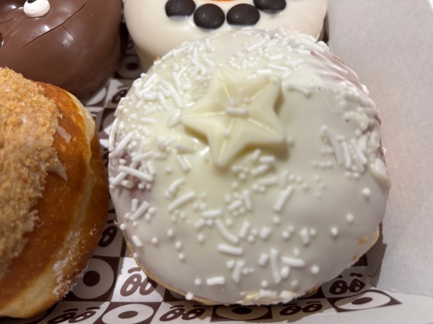 White Christmas: Filled with chantilly cream, dipped in smooth white chocolate, and topped with festive stars and sprinkles.