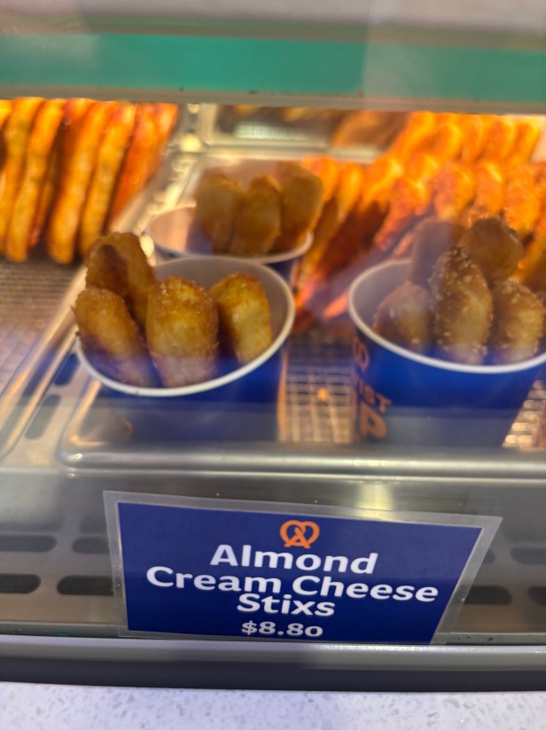 I chose the Almond Cream Cheese Stix. The sign in the window had the word ‘stixs’ with a superfluous ‘S’. I’m not sure why they need an S on the end of the word stix, but it’s their call.